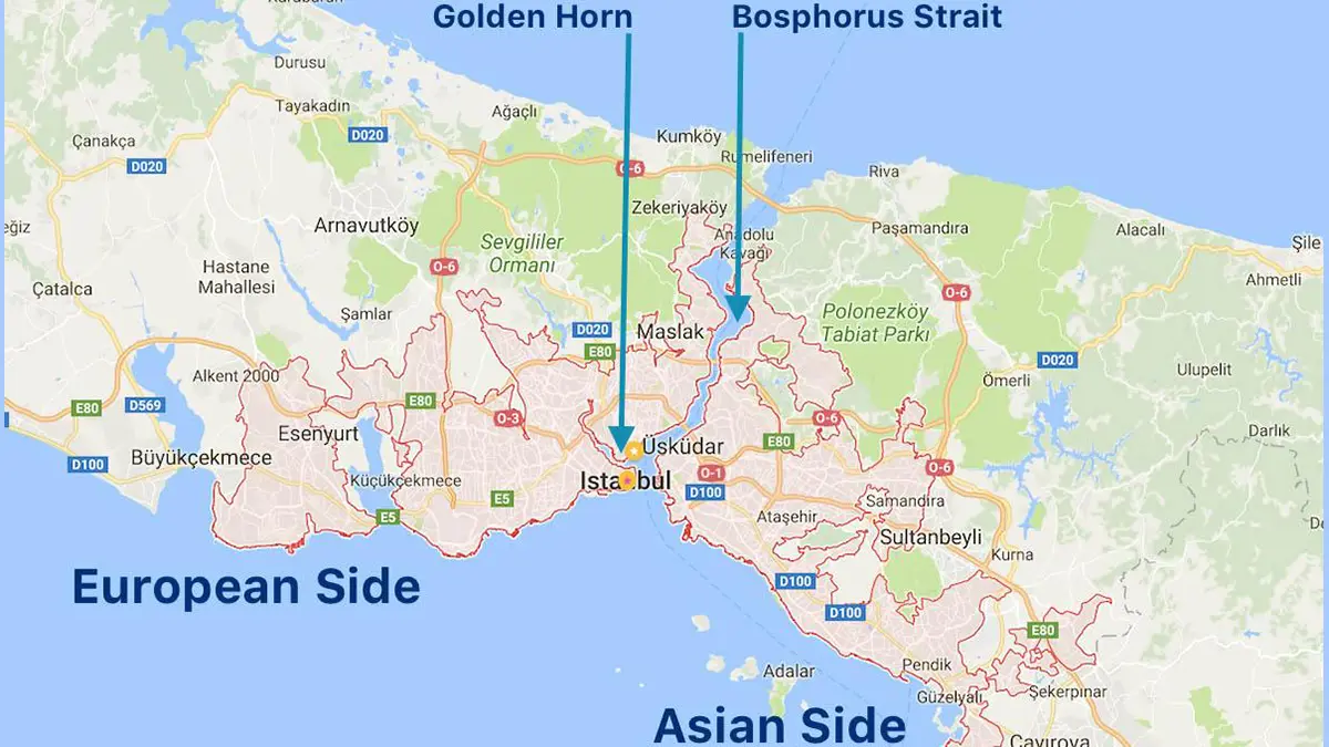 بخش اروپایی از طریق تنگه بسفر به بخش آسیایی متصل است. بخش اروپایی به مناطق معروفی مانند فاتح، بشیکتاش، بیاوغلو و شیشلی محدود میشود که در دل خود جاذبههای تاریخی، تجاری و گردشگری فراوانی دارند. از سوی دیگر، بخش آسیایی با مناطقی چون کادیکوی، اوسکودار و مالتپه بیشتر با محیطی آرام و خانوادگی شناخته میشود.